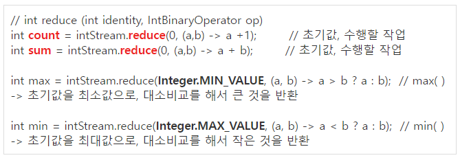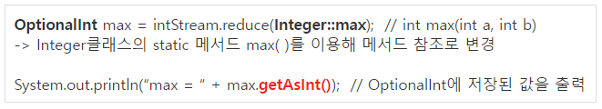 (단 intStream의 타입이 IntStream(기본형 스트림)일 경우OptionalInt)를 사용해야 한다. Stream<T>와 달리 IntStream(기본형)에 정의된 reduce( )의 반환타입이 OptionalInt이기 때문이다. 저장된 값을 꺼낼 때는 getAsInt()사용!!!