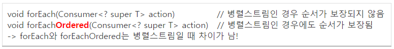 | void forEach(Consumer<? super T> action) void forEachOrdered(Consumer<? super T> action) (순서유지, 병렬스트림) |