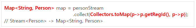 -> 요소의 타입이 Person인 스트림에서 key는 getRegId(): 주민번호, value는 객체 자기자신