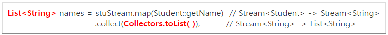 -> Stream이 Student인 stuStream에서 학생들 이름만 뽑아서 Stream<String>으로 만든 뒤 List<String>에 담은 것(학생 이름이 담긴 List생성!