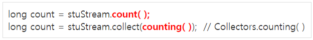 long count = Stream.of(stuArr).collect(counting()); // static java.util.stream.Collectors.*; 때문에 Collectors 생략가능