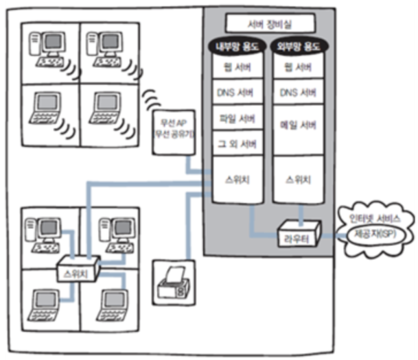 - 가정에서의 랜 구성과 다른 점은 DMZ라는 네트워크 영역이 있다.
