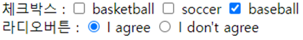 체크박스 : <input type="checkbox" name="hobby" value="basketball"/> basketball