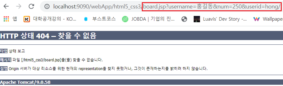 -> 현재 jsp파일이 없기 때문에 404 오류가 뜬다. username은 변수 홍길동은 데이터