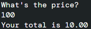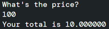 - “what’s the price”를 선언하면 세금을 포함한 값을 계산해서 “Your total is –“를 출력되게 하기