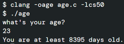 - “what’s your age?”를 선언하면 Your are at least – days old가 출력되게 하기(나이*365)