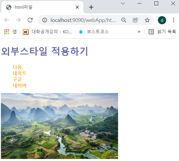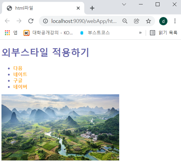 | <style>태그에서 <link>태그만 사용해 미리 만들어 놓은 외부 스타일 시트 파일 연결 |