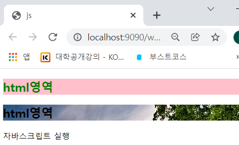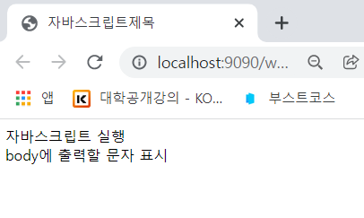 document.write("자바스크립트 실행","<br/>"); // <br/>로 개행을 해줘야 한다.