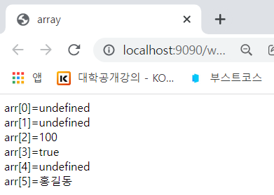 - java script의 배열의 크기는 유동적이고, 배열의 데이터형이 고정적이지 않다.