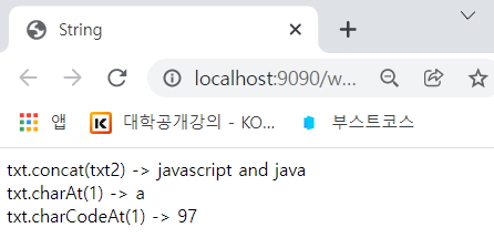 - txt1.concat(txt2), txt.charAt(인덱스), txt.charCodeAt(인덱스)