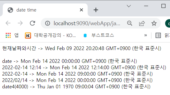 - new Date(milliseconds) : UTC를 기준으로 1970년 1월 1일 0시 0분 0초부터 현재까지 경과된 밀리초를 반환