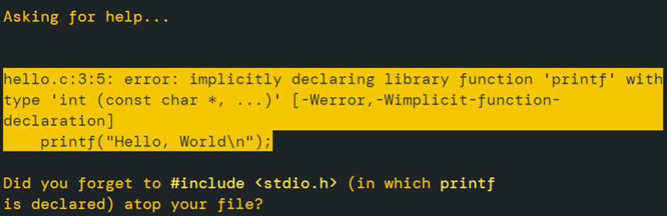 - 자체 help50 소프트웨어를 통해 이해 가능한 메시지를 찾을 수 있음