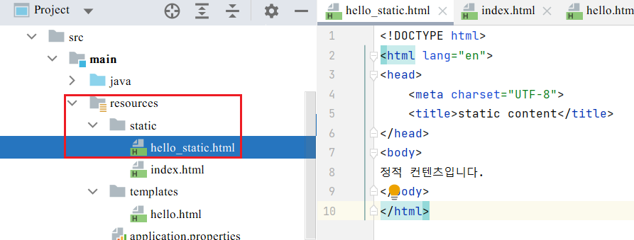 resouces > static에 > hello_static.html 파일 생성하고 실행한다.