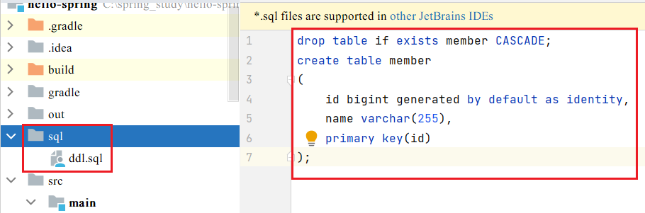 이렇게 src 상위 폴더에 sql 폴더를 만들고 ddl.sql 파일을 만들어서 쿼리 관리하면 편하고, git 할 때도 소스가 관리되어서 좋다.