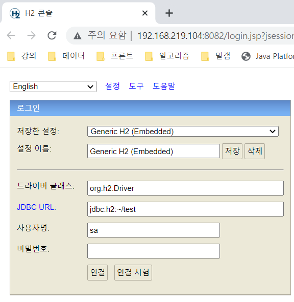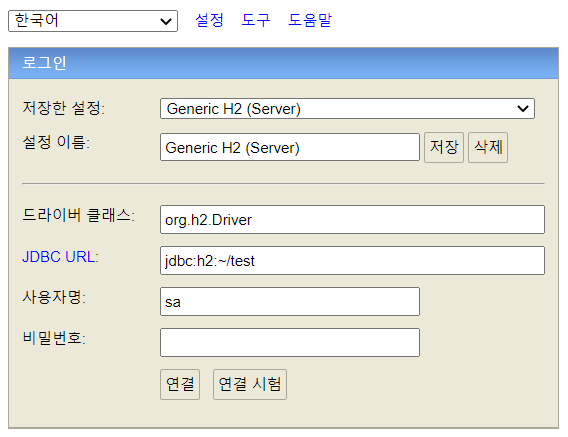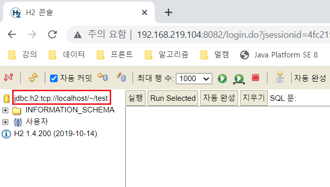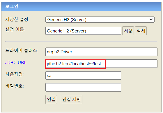 -> 이렇게 하는 이유는 JDBC URL에 ~/test 이렇게 파일로 접근하게 되면 애플리케이션이랑 웹 콘솔이 동시에 접근이 안되고 파일이 충돌 나면서 오류가 날 수 있다.