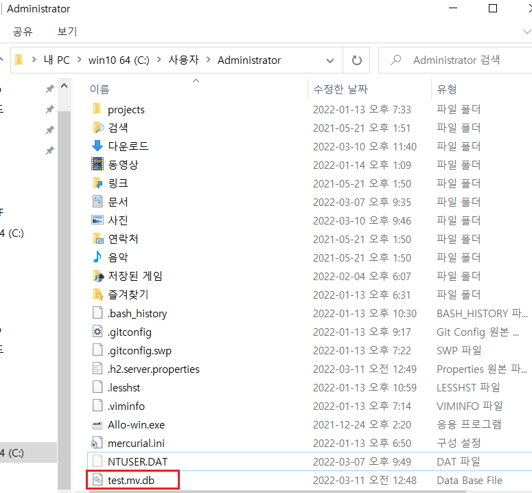 4. C:\Users\home(본인 홈 폴더)에 test.mv.db 파일이 생성되었는지 확인한다.