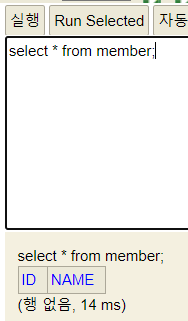 select * from member; 이렇게 쿼리문을 작성하면 밑에서 결과를 볼 수 있다.