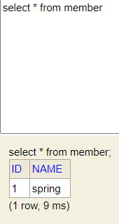 insert into member(name) values('spring'); + ctrl + enter => DB(member)에 insert 되었다.