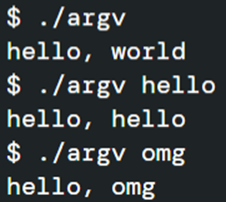 - 하지만 "./argv hello"로 실행하게 되면 "hello, hello"라는 값이 출력됨!