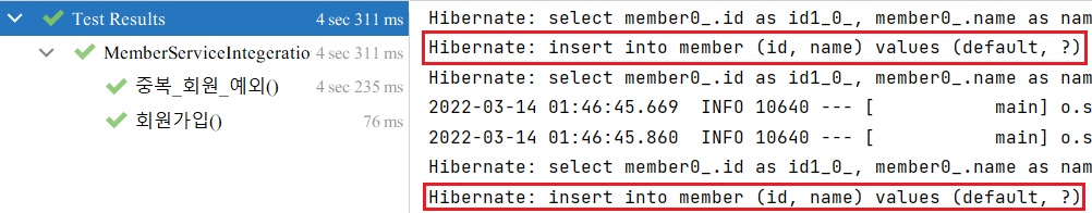 테스트가 정상적으로 동작하는 것을 확인할 수 있고, JPA가 생성한 SQL 또한 확인할 수 있다.