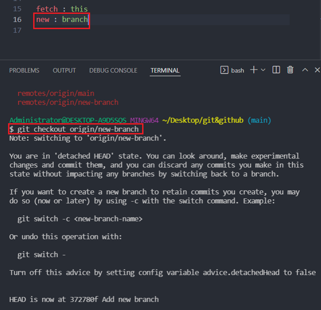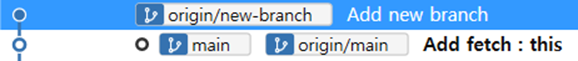 원격의 main 브랜치에 커밋 추가 (파일에 fetch : this 추가하고 커밋메시지: Add fetch : this)