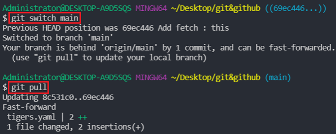 pull 한 것이 아니기 떄문에 mian 브랜치로 이동하게 되면 fetch : this가 보이지 않는다.