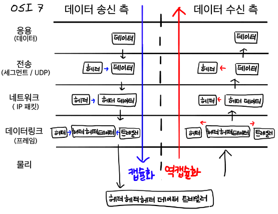 - 데이터를 상대방에게 보낼 때 각 계층에서 헤더(데이터 링크 계층의 트레일러도 포함)를 붙여 나가는 것을 캡슐화라고 함