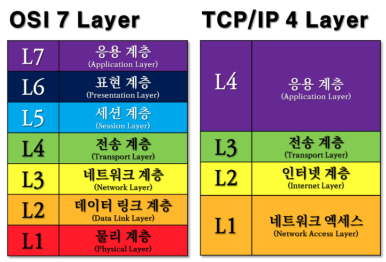 - OSI 모델 7계층의 네트워크에서 데이터를 전송하는 과정을 4개 계층(Layer)으로 단순화시킨 모델