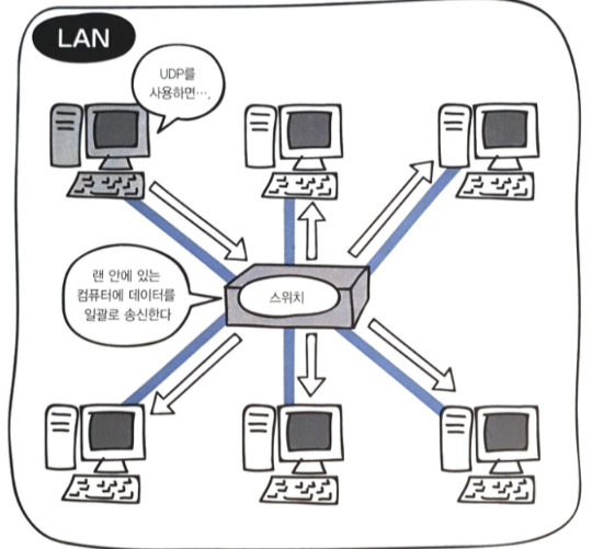 UDP에서의 브로드캐스트는 목적지에 관계없이 랜에서 일괄적으 보내지만, TCP는 목적지를 지정하지 않으면 안 되기 때문에 일괄 통신을 할 수 없다.