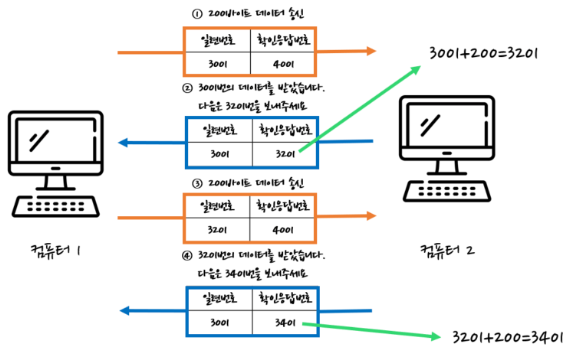 일련번호 '3001'번은 지금 보내는 200바이트 데이터의 첫 번째 바이트의 번호고, 확인 응답 번호는 다음에 보냈으면 하는 데이터의 첫 번째 바이트 번호가 된다.