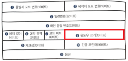 윈도우 크기(window size): 버퍼 용량의 크기, 얼마나 많은 용량의 데이털르 저장해둘 수 있는지를 나타낸다. 즉, 확인 응답을 일일이 하지 않고 연속해서 송신할 수 있는 데이터 크기