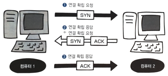 - 통신을 하려면 컴퓨터2에게 허가를 받아야 해서, 컴퓨터1에서 컴퓨터2로 연결 확립 허가를 받기 위한 요청(SYN)을 보낸다.