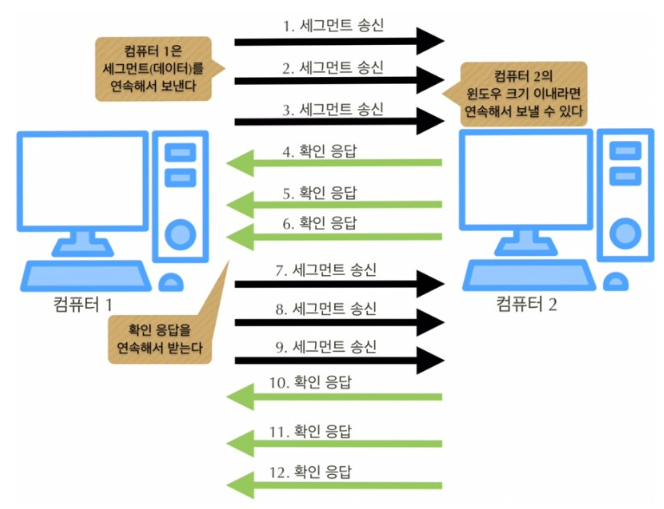 - 컴퓨터1은 세그먼트(데이터)를 연속해서 보내고, 컴퓨터2의 윈도우 크기 이내라면 계속해서 보낼 수 있다.