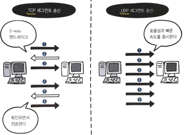 | 신뢰성/정확성이 우선인 통신이라서 여러 번 확인하고 보낸다. | 효율성이 우선인 통신이라서 확인 절차 없이 일방적으로 보낸다. |