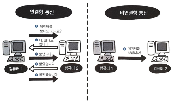 | 상대편과 확인해 가면서 통신하는 방식 | 상대편을 확인하지 않고 일방적으로 데이터를 전송하는 방식 |