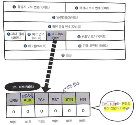 TCP 헤더의 코드 비트는 TCP 헤더의 107번째 비트부터 112번째 비트까지의 6비트로 연결의 제어 정보가 기록되는 곳이다.