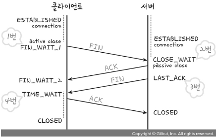 - 클라이언트는 TIME_WAIT 상태가 되고 다시 서버로 ACK를 보내서 서버는 CLOSED 상태가 된다. 이후 클라이언트는 어느 정도의 시간을 대기한 후 연결이 닫히고 클라이언트와 서버의 모든 자원의 연결이 해제된다.