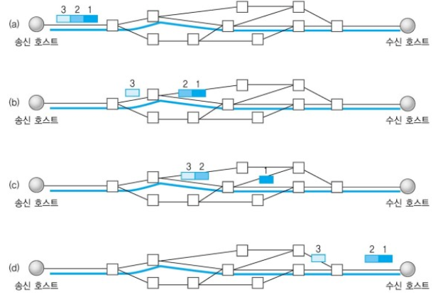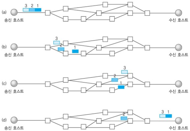 데이터그램 패킷 교환 방식: 패킷을 수신한 라우터는 최적의 경로를 선택해 패킷을 전송하는 데, 하나의 메시지에서 분할된 여러 패킷은 서로 다른 경로로 전송될 수 있는 방식(비연결 지향형)