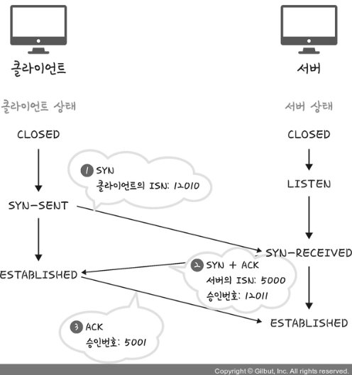 - SYN 단계: 클라이언트는 서버에 클라이언트의 ISN을 담아 SYN을 보낸다. ISN은 새로운 TCP 연결의 첫 번째 패킷에 할당된 임의의 시퀀스 번호를 말하며 이는 장치마다 다를 수 있다.