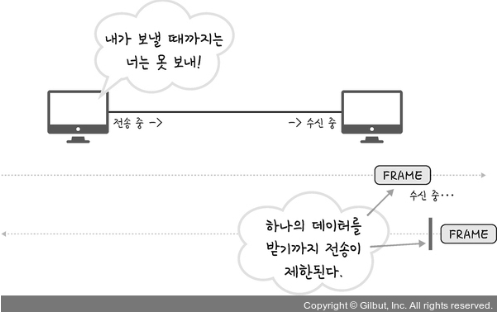 - 수신로와 송신로를 각각 둔 것이 아니고 한 경로를 기반으로 데이터를 보냈기 때문에 데이터를 보낼 때 충돌에 대비해야 했기 때문에 이 방식을 사용했었다.
