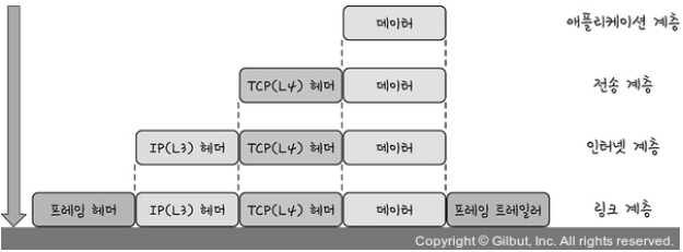 상위 계층의 헤더와 데이터를 하위 계층의 데이터 부분에 포함시키고 해당 계층의 헤더를 삽입하는 과정