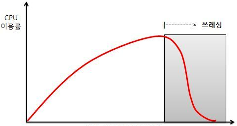 Thrashing(쓰레싱) - 메모리 영역에 접근하게 될 때, 메모리에 페이지 부재(=페이지 폴트(Page fault)율이 높은 것을 의미하며, 심각한 성능 저하를 초래합니다. - 활발하게 사용되는 페이지 집합을 지