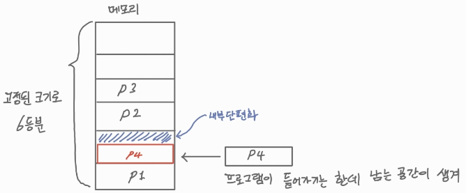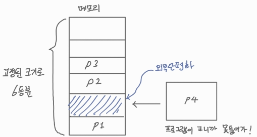 | 메모리 공간은 비어있지만 프로세스를 적재시키지 못해서 낭비됨 | 하나의 분할 공간에는 하나의 프로세스만 들어가기 때문에 다른 프로그램이 들어갈 수 없어서 메모리가 낭비됨 |
