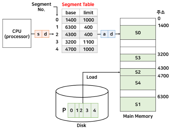 - 세그먼트를 메모리에 할당할 때는 페이지를 할당하는 것과 동일한데 이 때 segment table을 활용해서 메모리에 접근하게 된다.