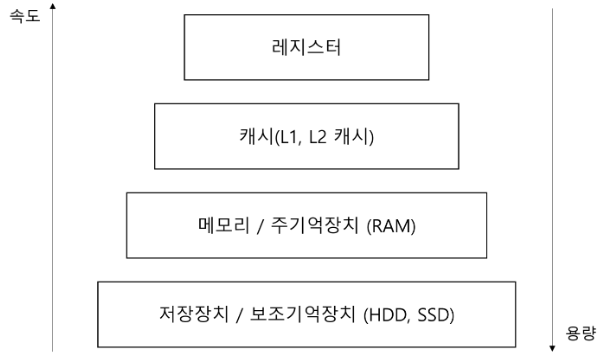 | 아래 계층으로 갈 수록 속도가 느려지고 용량이 많아지며 가격이 싸진다. | 캐싱 계층을 통해 구현한다. |