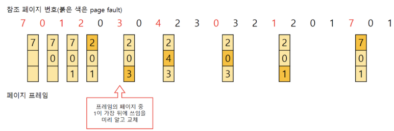 - 운영체제는 페이지 테이블을 확인해 가상 메모리에 페이지가 존재하는지 확인해서 없으면 프로세스를 중단하고 현재 물리 메모리에 비어 있는 프레임이 있는지 찾는다. 이 때 비어 있는 프레임이 없다면 페이지 교체 알고리즘을 통해 교체할 페이지를 골라야 한다.