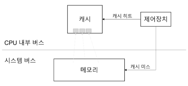 | 캐시에서 원하는 데이터를 찾은 것으로 해당 데이터를 제어장치를 거쳐 가져오는 것 | 캐시에 원하는 데이터가 없어서 주 기억장치(메모리)에서 데이터를 찾아오는 것 |