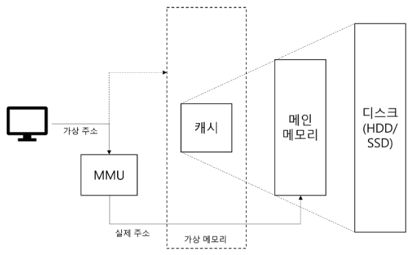 | 메모리관리장치(MMU)에 의해 실제 주소로 변환되며, 사용자는 실제 주소를 의식할 필요 없이 프로그램을 구축할 수 있게 된다. |