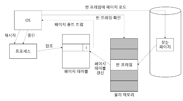 - CPU는 찾으려는 페이지가 물리 메모리에 없으면 트랩(Page Fault Trap)을 발생해서 운영체제에 알린다.