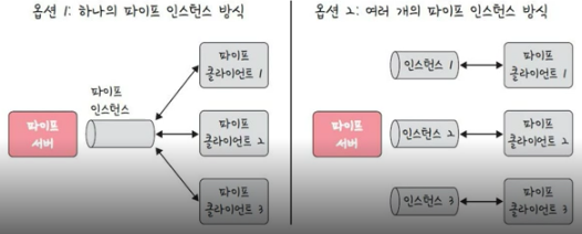 위의 그림처럼 보통 서버용 파이프와 클라이언트용 파이프로 구분해서 작동해 하나의 인스턴스를 열거나 여러 개의 인스턴스를 기반으로 통신한다.